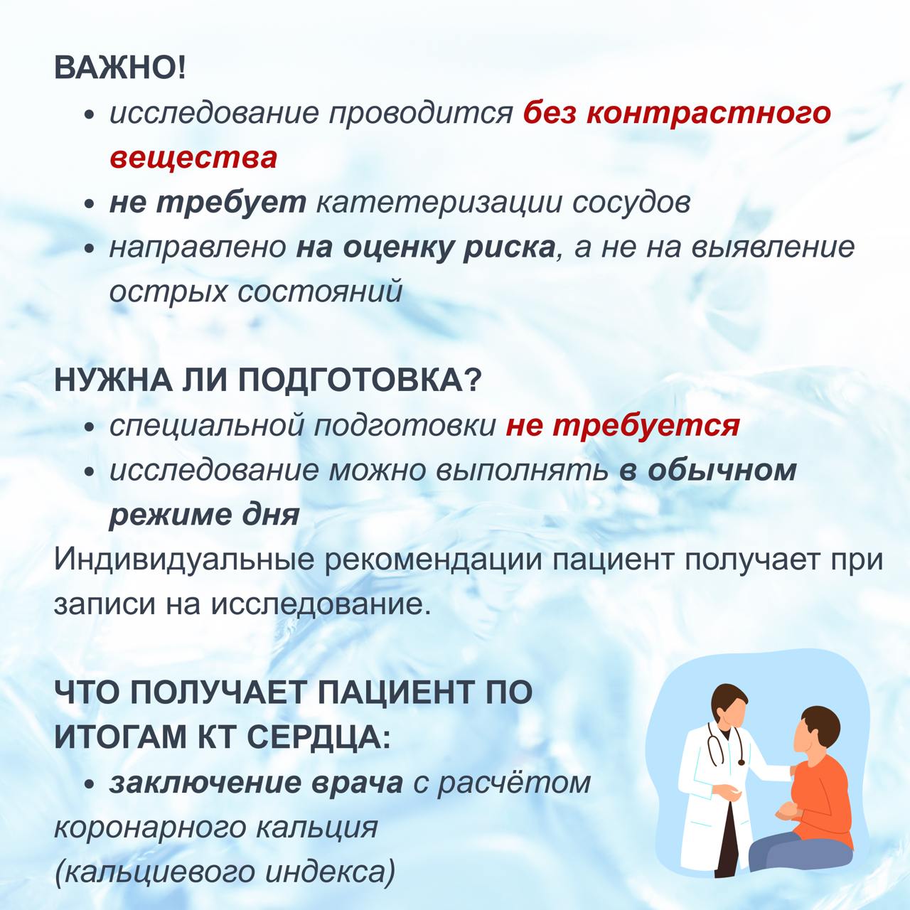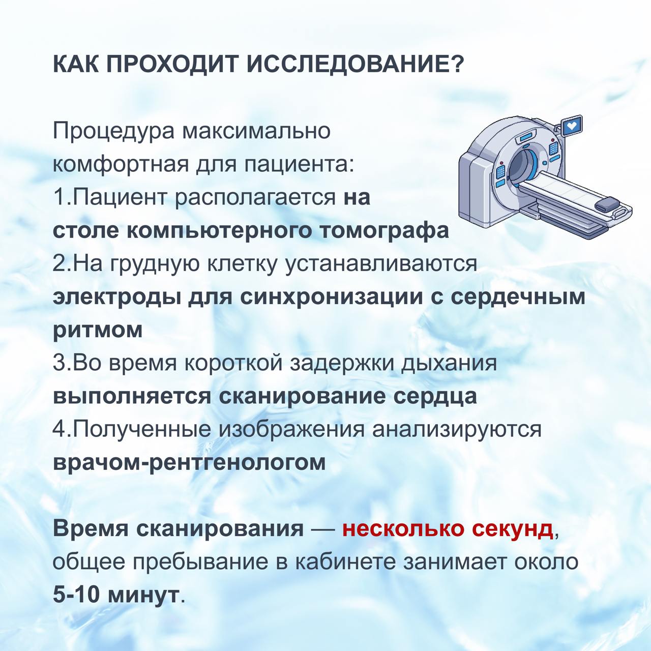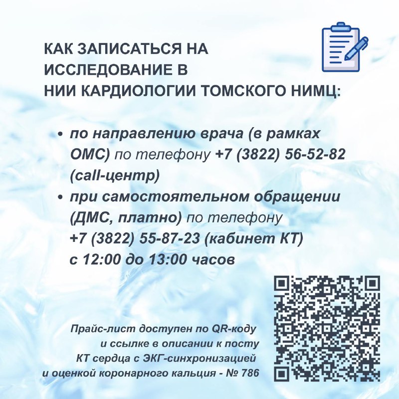 Исследование выполняется быстро, без контраста и специальной подготовки на базе отделения рентгеновских и томографических методов диагностики НИИ кардиологии Томского НИМЦ.