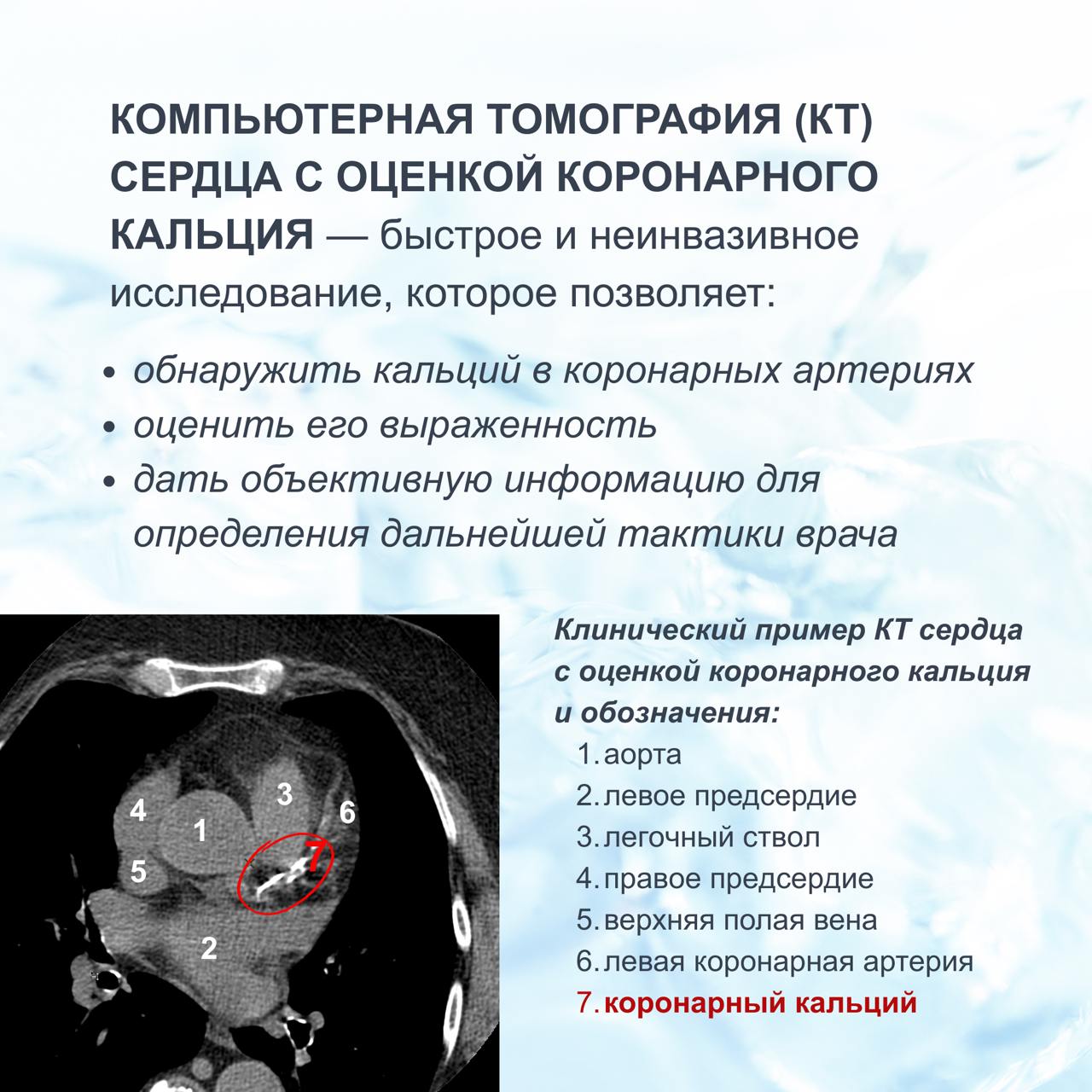 КТ сердца с оценкой коронарного кальция — быстрое и неинвазивное исследование, которое позволяет: