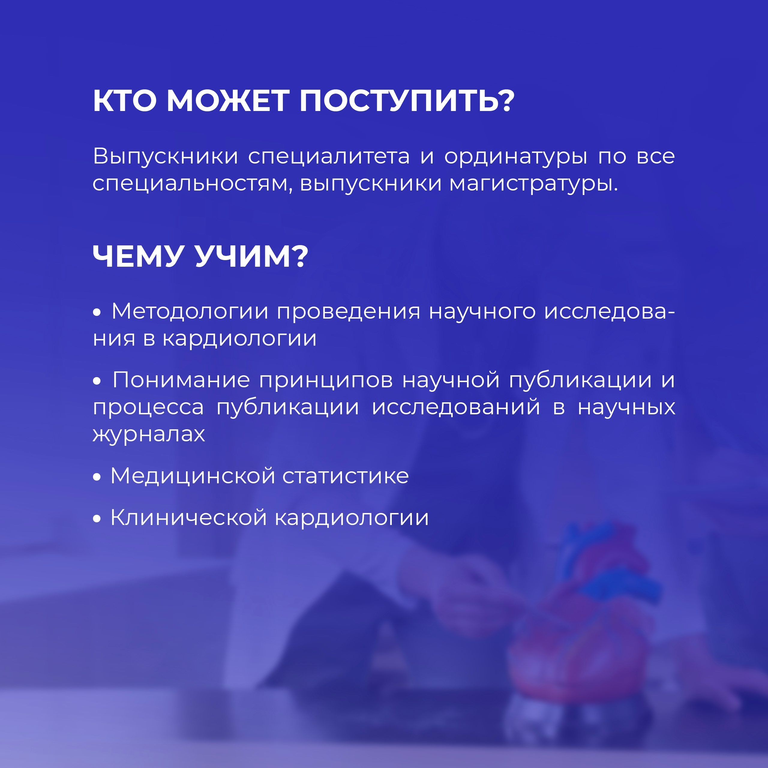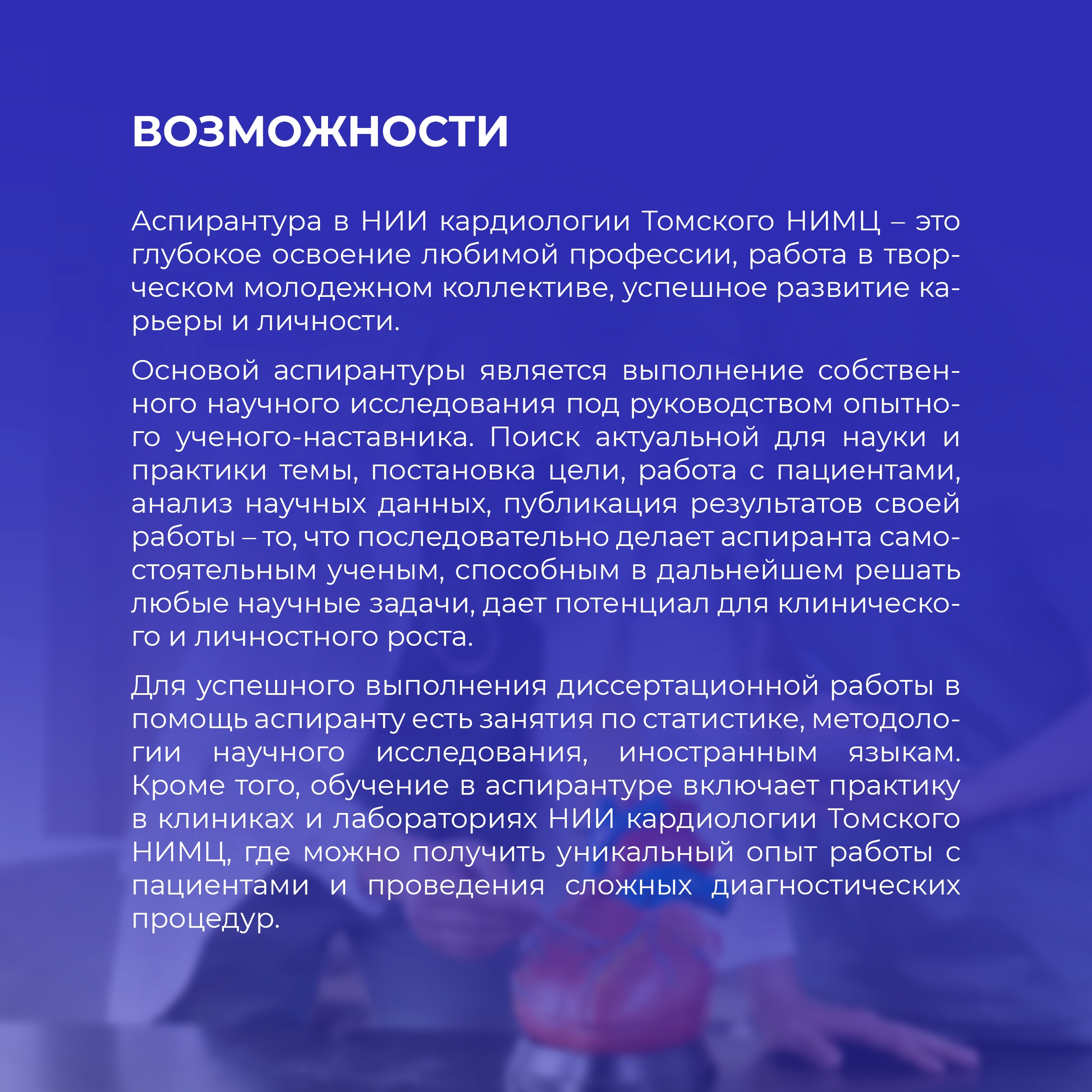 Аспирантура в НИИ кардиологии Томского НИМЦ – это глубокое освоение любимой профессии, работа в творческом молодежном коллективе, успешное развитие карьеры и личности.