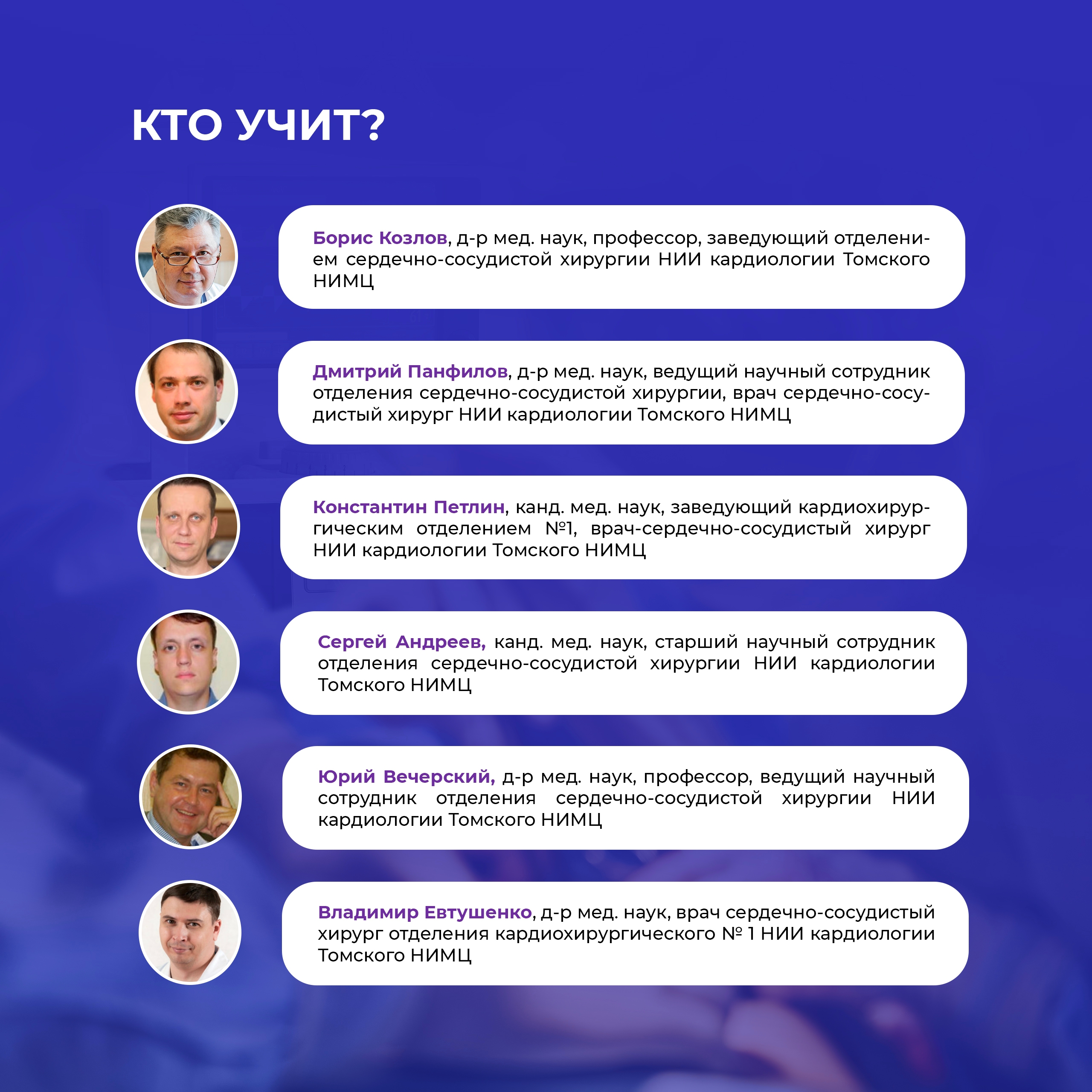 Подготовка кадров высшей квалификации в аспирантуре по специальности «Сердечно-сосудистая хирургия» проводится на базе НИИ кардиологии Томского НИМЦ.