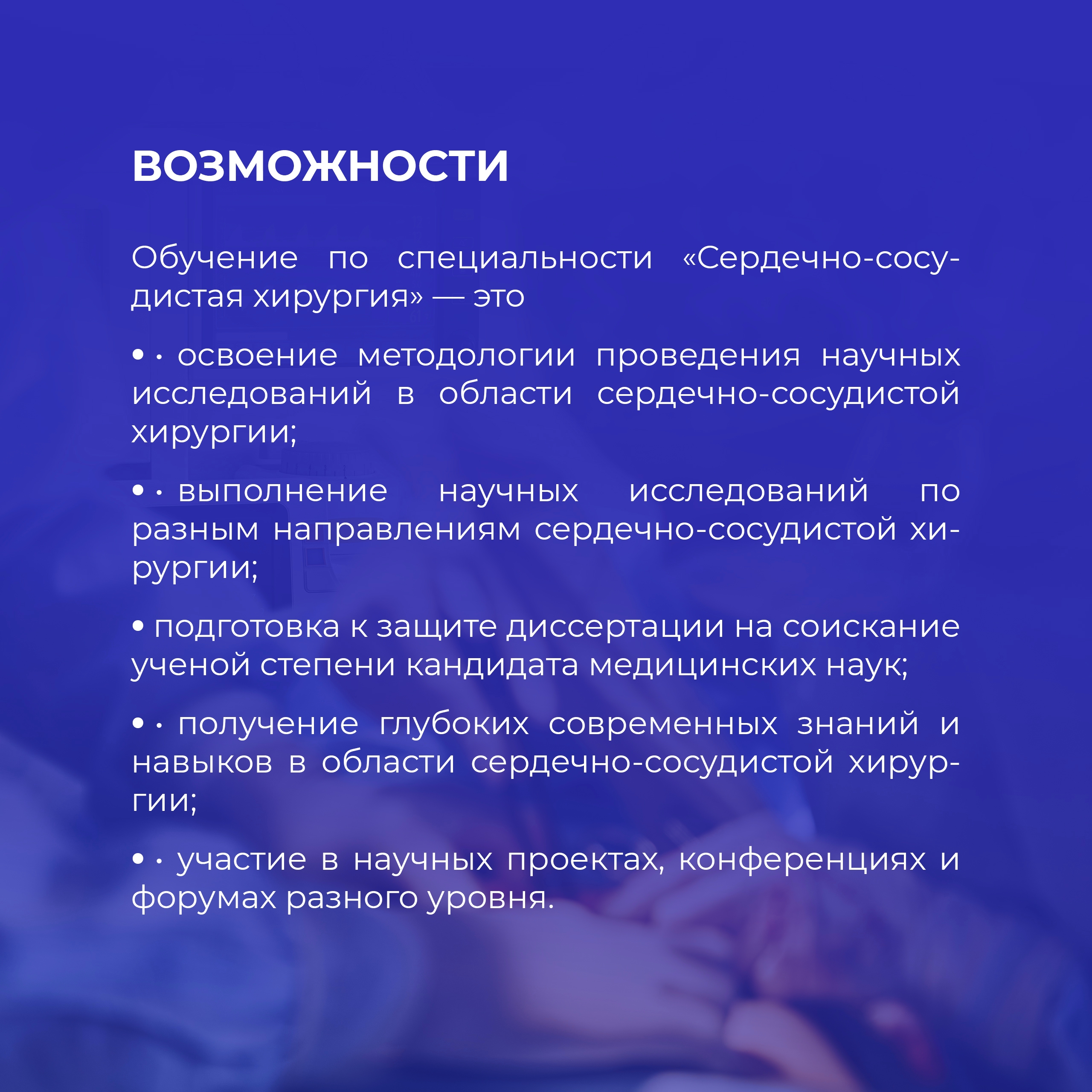 - освоение методологии проведения научных исследований в области сердечно-сосудистой хирургии;