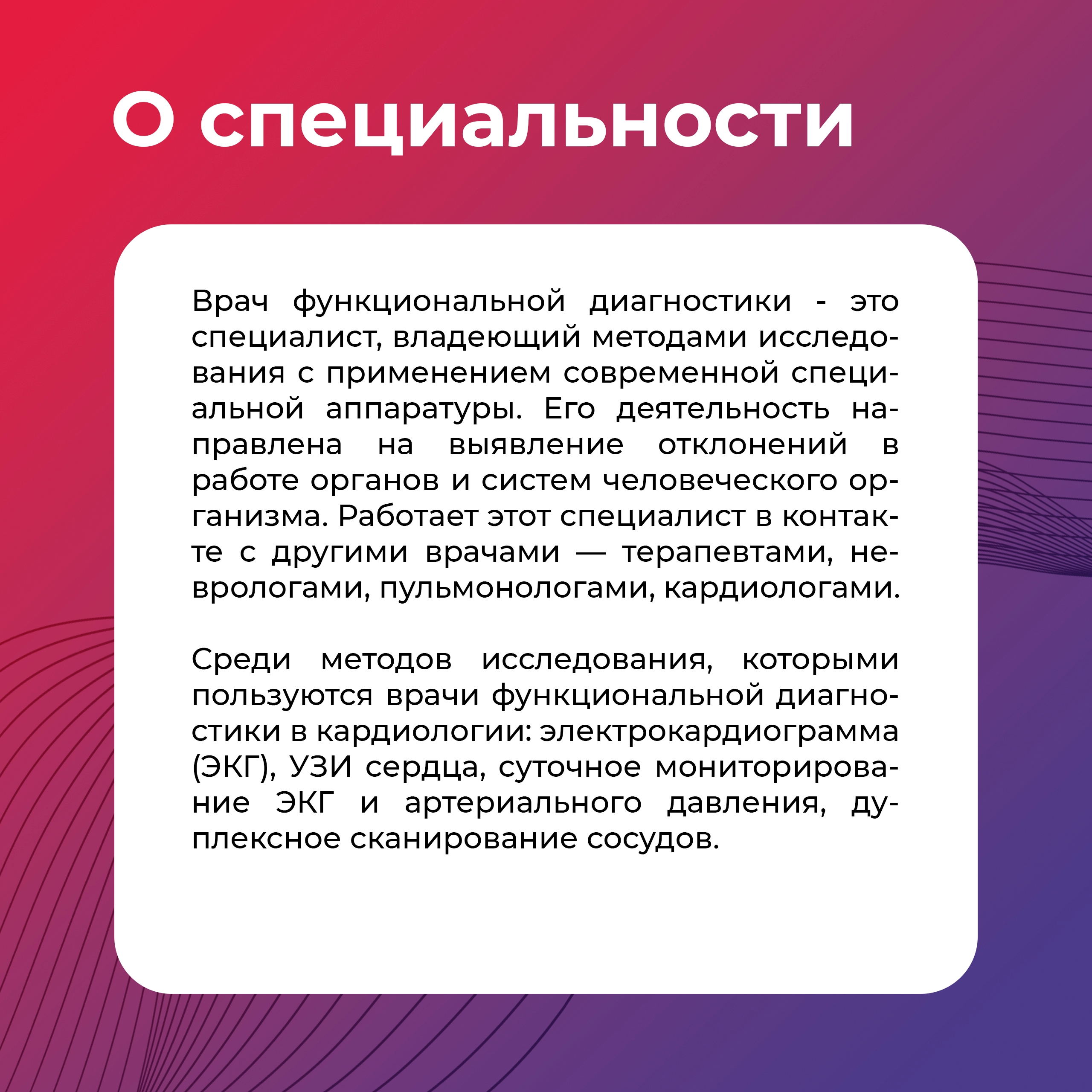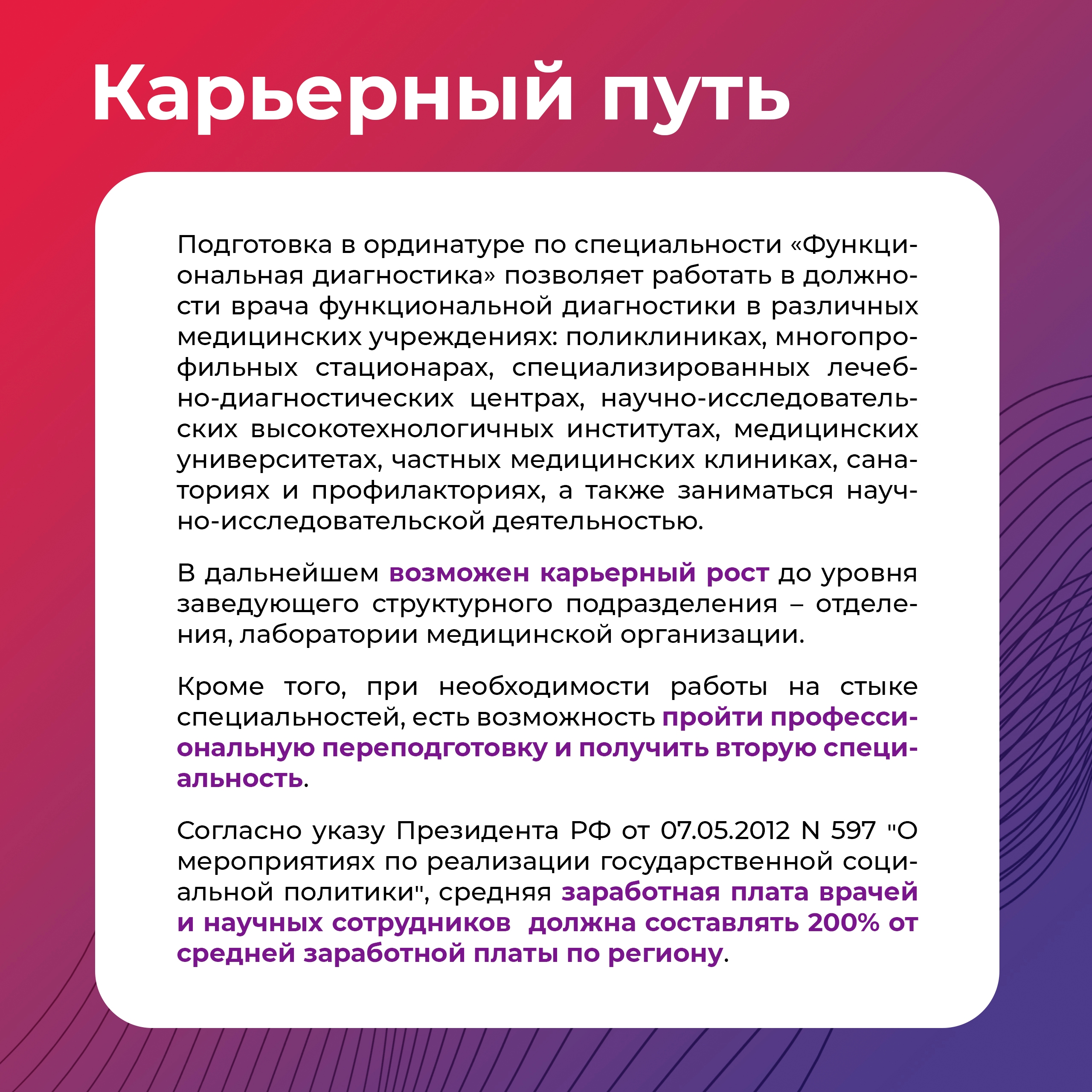 По окончании обучения вы сможете работать в должности врача функциональной диагностики в различных медицинских учреждениях: поликлиниках, многопрофильных стационарах, специализированных лечебно-диагностических центрах, научно-исследовательских высокотехнологичных институтах, медицинских университетах, частных медицинских клиниках, санаториях и профилакториях, а также заниматься научно-исследовательской деятельностью. В дальнейшем возможен карьерный рост до уровня заведующего структурного подразделения – отделения, лаборатории медицинской организации.