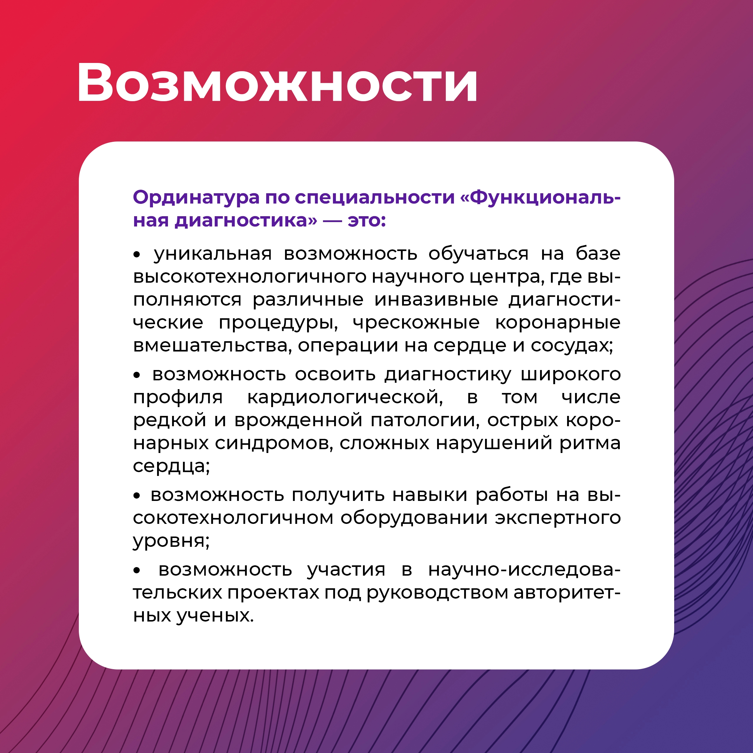 Подготовка кадров высшей квалификации в ординатуре по специальности «Функциональная диагностика» проводится на базе НИИ кардиологии Томского НИМЦ.
