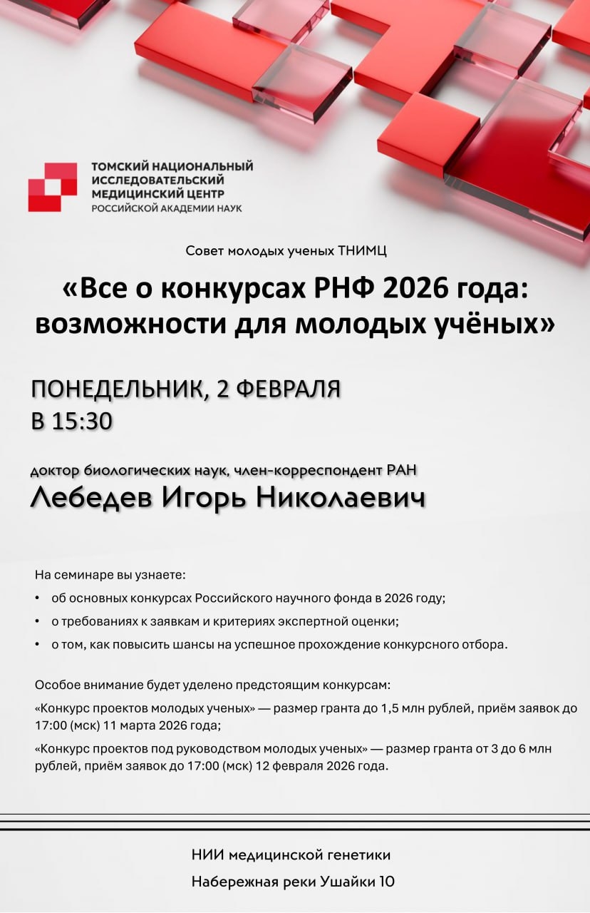 Совет молодых ученых Томского НИМЦ приглашает принять участие в семинаре, посвященном конкурсам Российского научного фонда в 2026 году. Участники узнают обо всех нюансах подачи заявок, условиях участия и успешного прохождения конкурсного отбора.